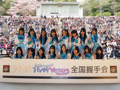 「バンザイVenus」ではじめてオリコン一位を獲得したSKE48。発売記念握手会が、全国で行われ、総計5000人のファンが詰め寄せた。SKE48はファンから力を分けてもらい、さらなる飛躍を目指す。今年は、握手会だけでなく、ライブも全国で開催するという目標を掲げ、SKE48の驀進は続く。いつの間にか57人も集まってしまったSKE48がこれからどこまで増えるのか、今から期待が高まる。ん?そこじゃないって?ちなみに、会場には義援金を募る募金箱も用意されていました。